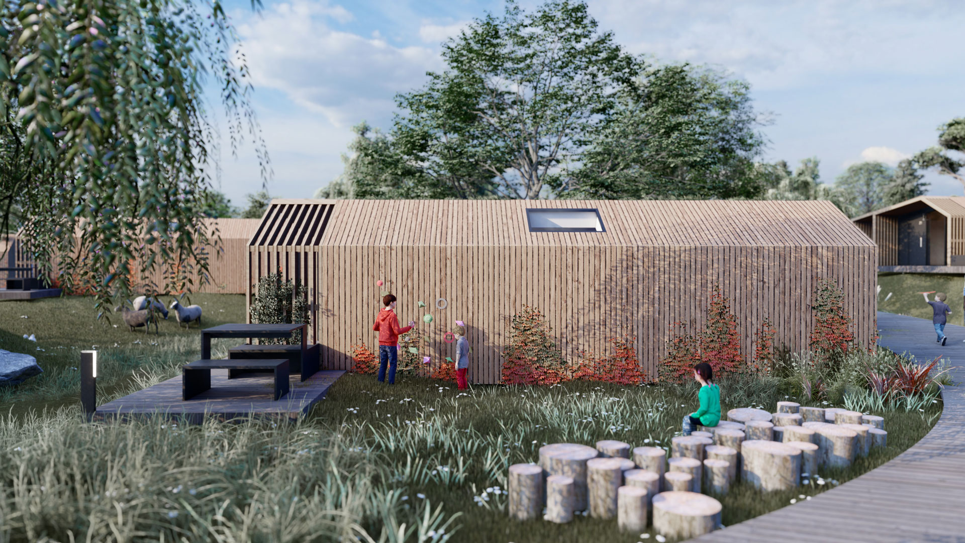 Autour du lodge, une terrasse et des jeux pour enfants permettent de créer une ambiance paisible et ludique pour favoriser la déconnexion. Sur le flanc du lodge, un petit mur d'escalade permet aux plus jeunes de s'initier aux sports et activités de plein air.